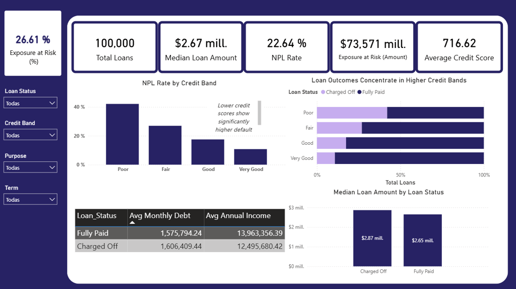 The objective is to assess portfolio exposure, default risk, and borrower financial profiles, delivering actionable insights through a professional Power BI dashboard.